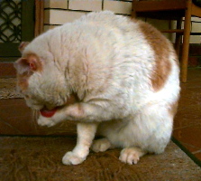 Feeding him is never a big problem. Ever since he was small he hasn't been too fussy. Of course he loves cat food, fish and meat. But he'll happily eat most edible things, including: cheese, breakfast cereal, nuts, raisins, rockmelon, bread, cake and pasta. He often fulfils a valuable function of polishing off most leftovers.