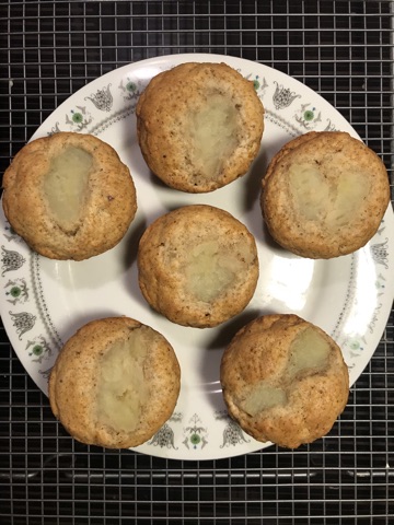 - If making muffins: Spread mixture equally among two 6-muffin trays. Top each muffin with pieces of apple pie fruit (according to your preference). Bake for around 20 minutes if using muffin trays, or until skewer comes out clean.